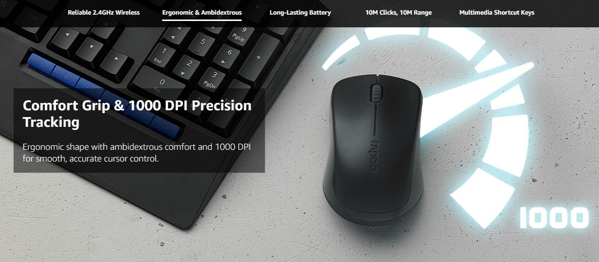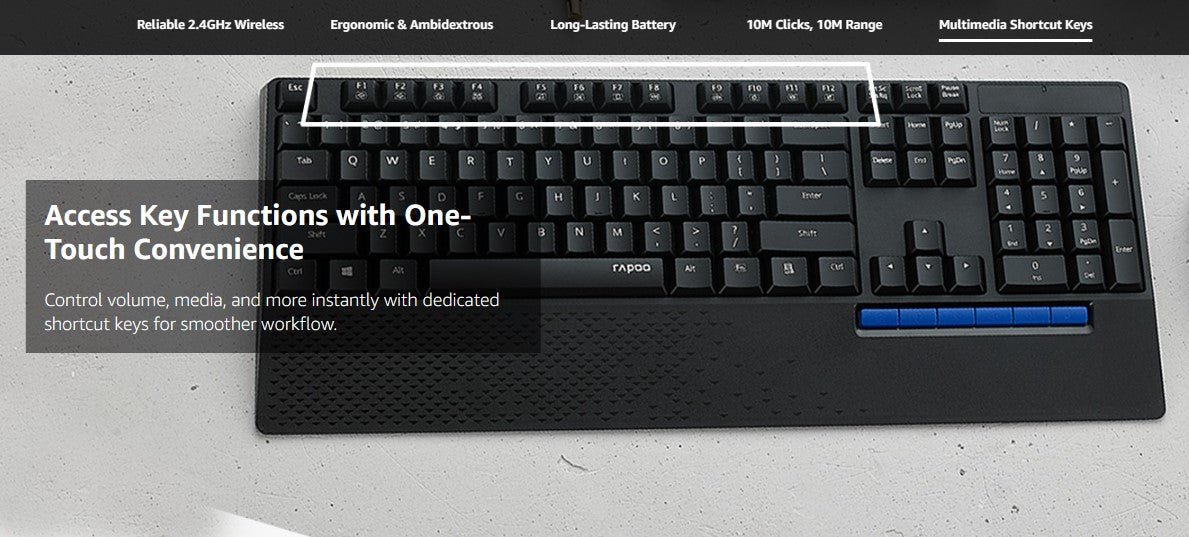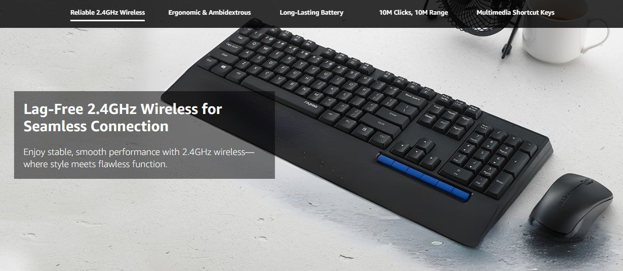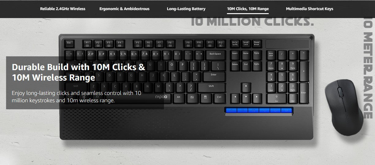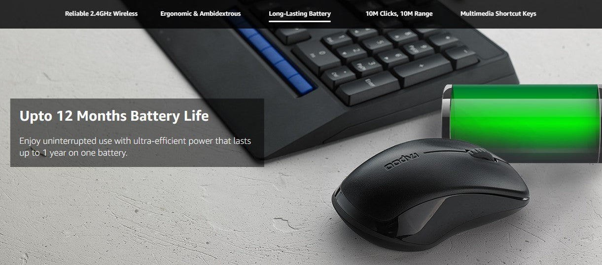 - Up to 12 months battery life Thanks to Rapoo’s energy-saving technologies, combined with the on/off switch, you can use this set without replacing batteries for up to 12 months.