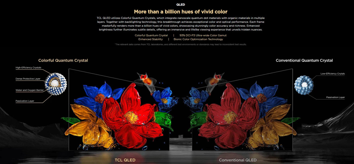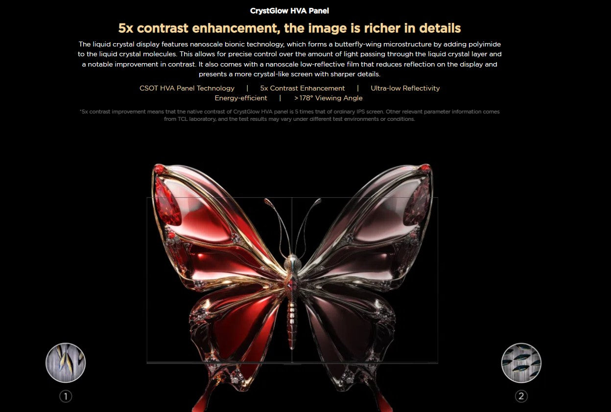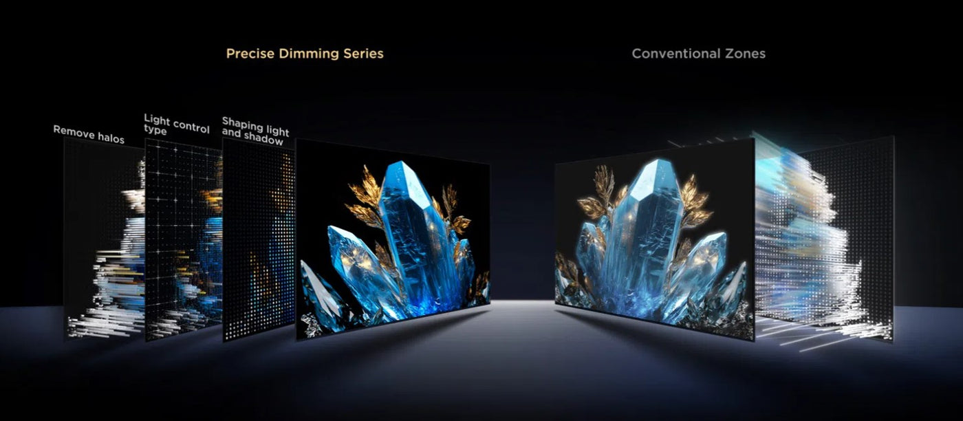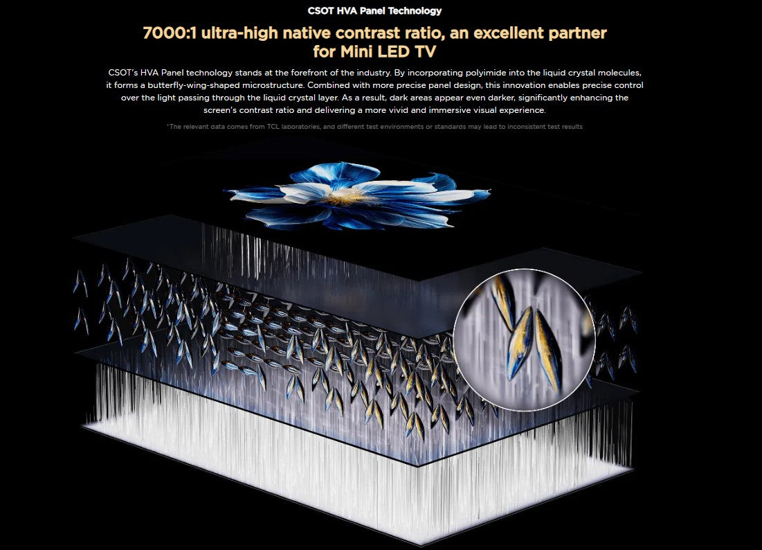Featuring world-leading precise dimming with up to 2880 dimming zones this large screen TV produces deep blacks and vibrant colors, while the CrystGlow HVA panel enhances contrast for a more detailed viewing experience no matter the lighting conditions.