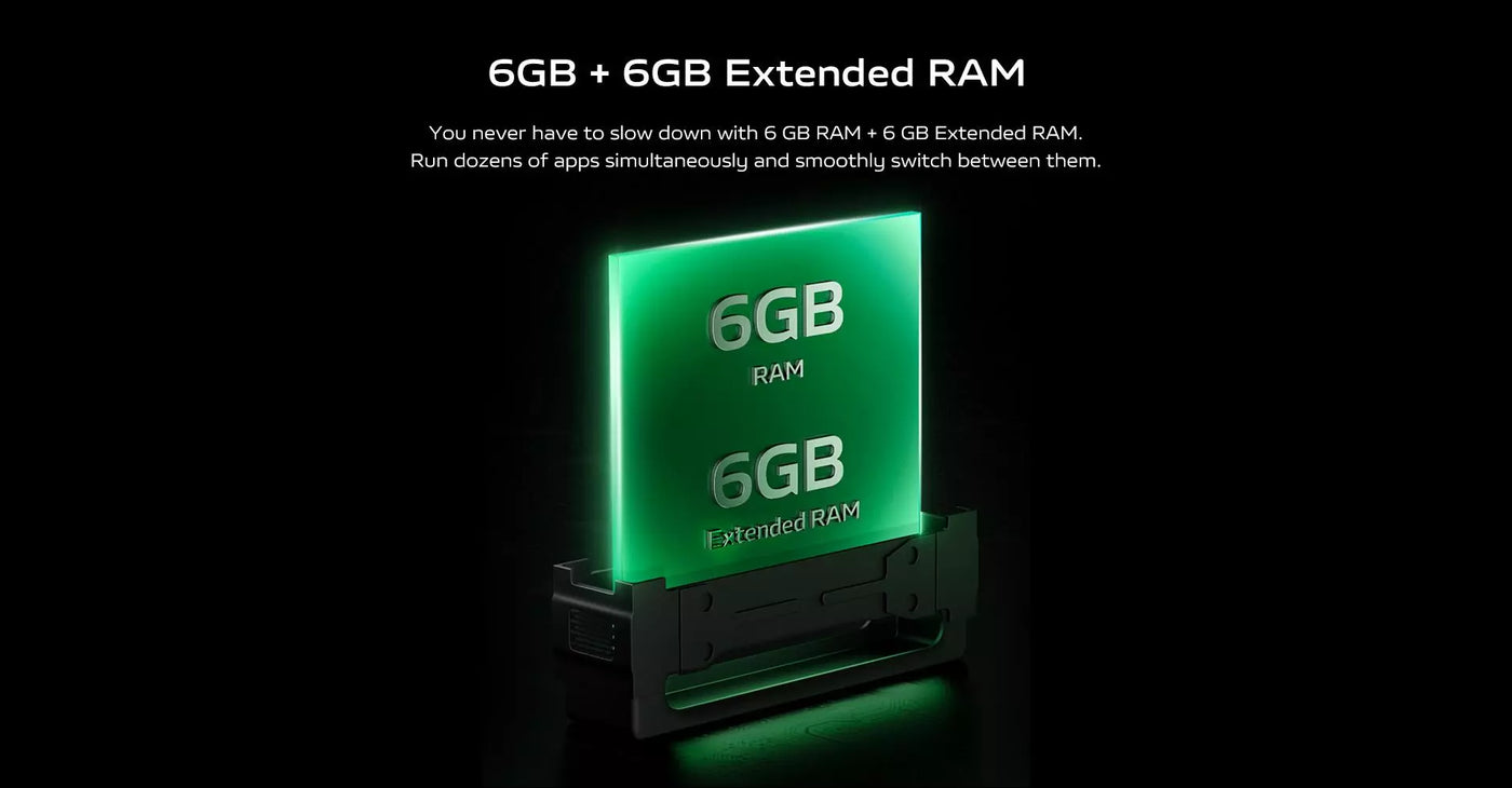 You never have to slow down with 6 GB RAM + 6 GB Extended RAM. Run dozens of apps simultaneously and smoothly switch between them.