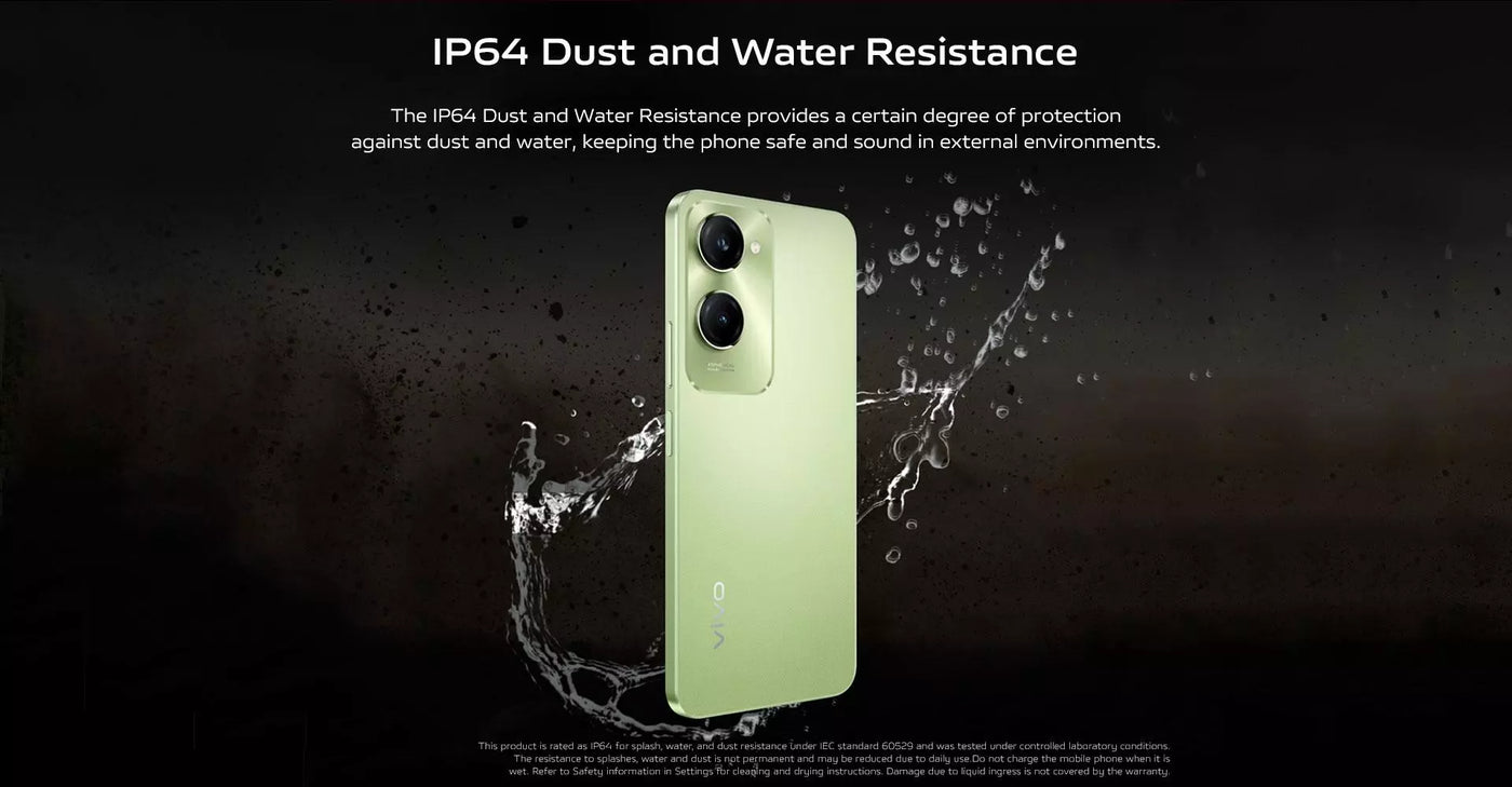 The IP64 Dust and Water Resistance provides a certain degree of protection against dust and water, keeping the phone safe and sound in external environments.