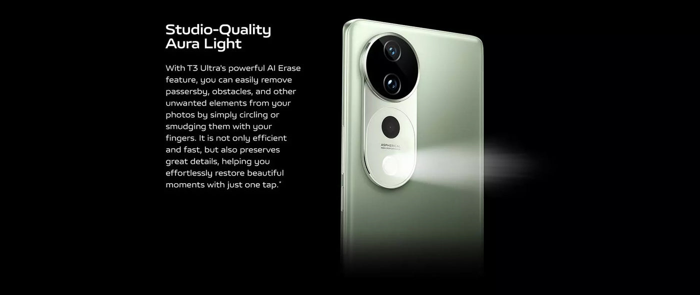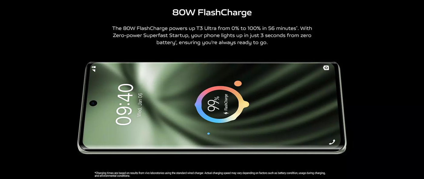 The 80 W FlashCharge powers up T3 Ultra from 0% to 100% in 56 minutes. With Zero-power Superfast Startup, your phone lights up in just 3 seconds from zero battery', ensuring you're always ready to go.