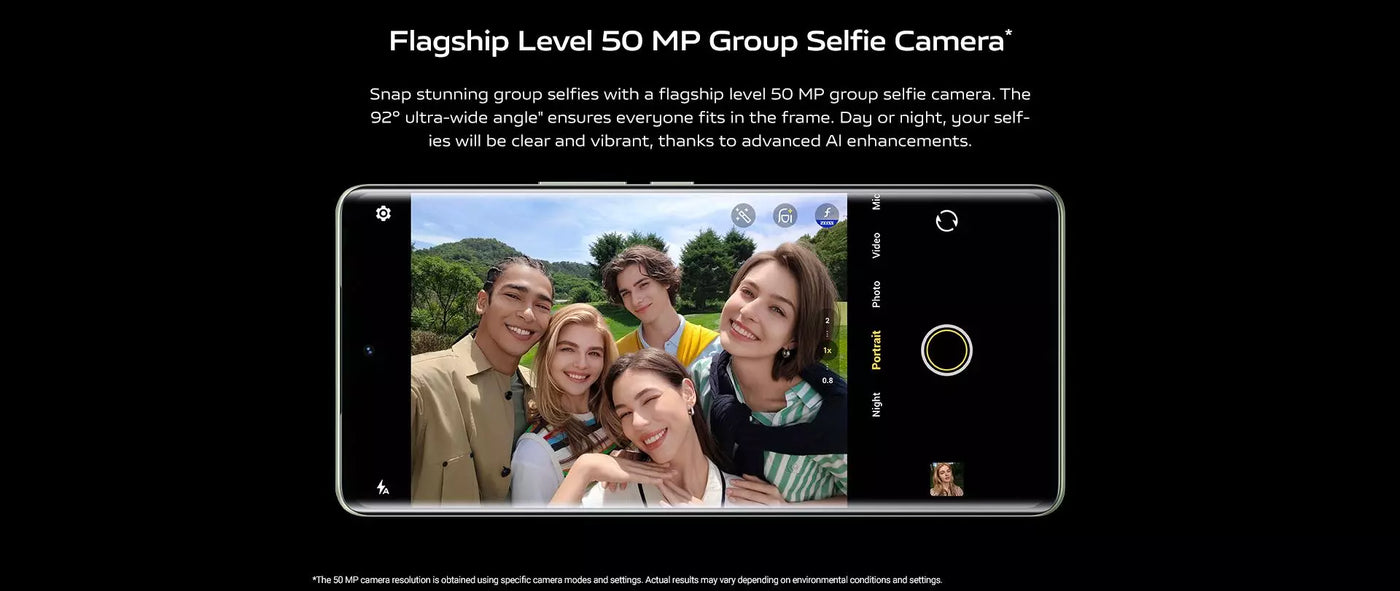 Snap stunning group selfies with a flagship level 50 MP group selfie camera. The 92° ultra-wide angle ensures everyone fits in the frame. Day or night, your selfies will be clear and vibrant, thanks to advanced Al enhancements.