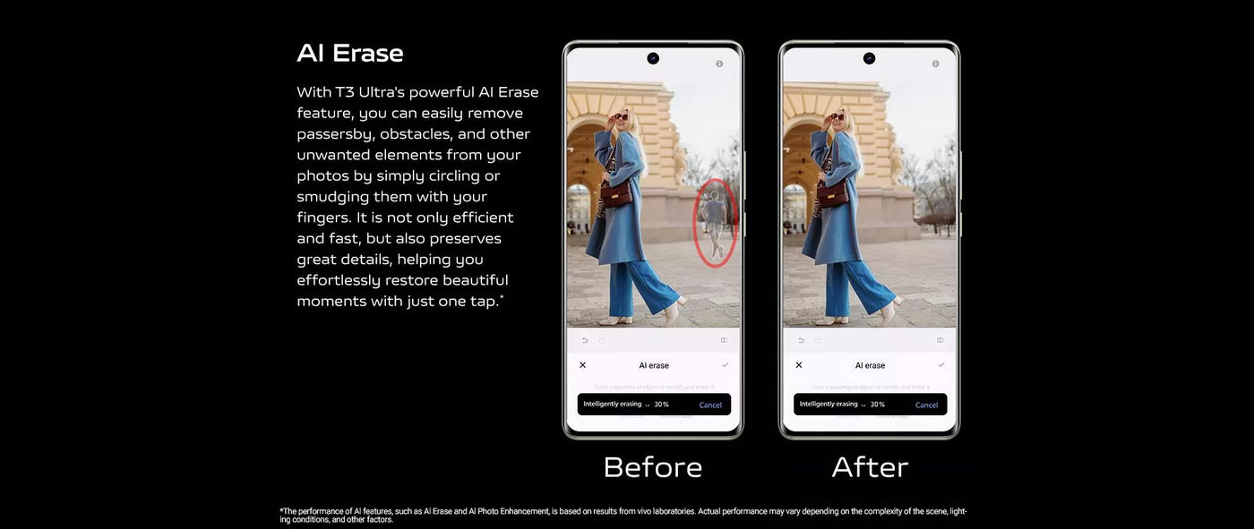 With T3 Ultra's powerful AI Erase feature, you can easily remove passersby, obstacles, and other unwanted elements from your photos by simply circling or smudging them with your fingers. It is not only efficient and fast, but also preserves great details, helping you effortlessly restore beautiful moments with just one tap.