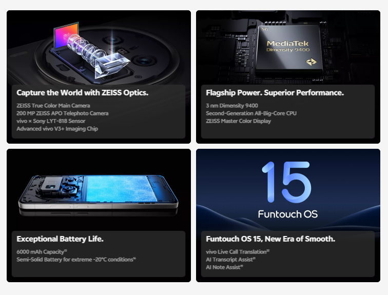 Vivo Live Call Translation – Overcome language barriers with real-time, two-way translation for more accurate, efficient calls and seamless communication.. Circle to Search – Just circle, highlight, or doodle on an image to initiate searching, providing an all-new mobile search method. Gemini Assistant – vivo X200 comes with Gemini Assistant. Get help learning in new ways, writing emails, planning events, and more.