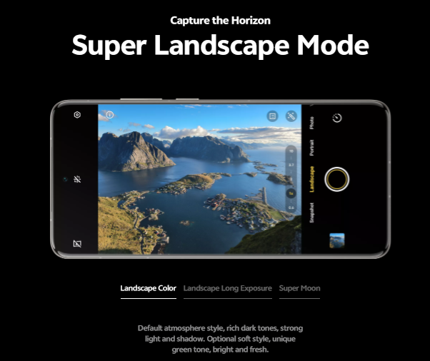 - An industry-first, Landscape Mode blends nightscape, moonlight, starlight, and long exposure into one -capturing breathtaking shots with a single tap.