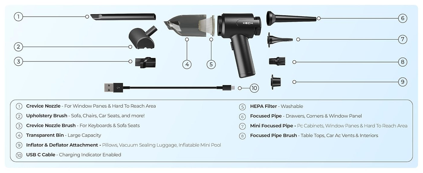 Included Components | Crevice Tool, Dusting Brush, Side Brushes |